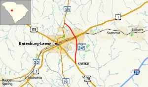 South Carolina Highway 245 (SC 245) is a 5.060-mile-long (8.143 km) state highway in the U.S. state of South Carolina. The highway was built and paved in 1932 as a short spur of SC 24 passing north through Leesville to connect with SC 391.[2] Since being built, that section of SC 24 was redesignated as US 178 in 1933, and Leesville merged in 1992 with Batesburg, where US 1 and SC 391 intersect, to form the town of Batesburg-Leesville. It is known locally as North Lee Street north of the railroad tracks, and as South Lee Street south of the railroad tracks. There are two traffic lights along SC 245.[3]