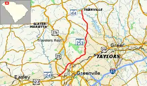 South Carolina Highway 253 (SC 253) is a 19.656-mile (31.633 km) primary state highway in the U.S. state of South Carolina. It runs in Greenville and is the gateway to Paris Mountain State Park and runs from Parker to Tigerville.