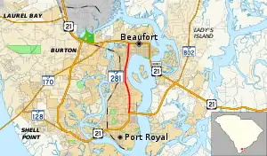 South Carolina Highway 281 (SC 281) is a 3.190-mile (5.134 km) state highway located entirely within Beaufort County, in the southern part of the U.S. state of South Carolina. Known locally as Ribaut Road (pronounced REE-bo), SC 281 serves as an arterial connecting Beaufort and Port Royal.