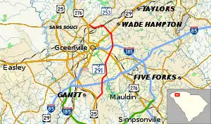 South Carolina Highway 291 (SC 291), locally known as Pleasantburg Drive, is a 11.400-mile (18.347 km) state highway in the western part of the U.S. state of South Carolina. It travels as a major commercial artery for the eastern sections of Greenville in Greenville County. The highway travels by Greenville Technical College, the Greenville Downtown Airport, and Bob Jones University.[2] The road south of U.S. Route 276 (US 276), Laurens Road, is called South Pleasantburg Drive, while the road north of Laurens Road is called North Pleasantburg Drive.[2] The highway also connects Gantt with Sans Souci.
