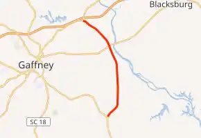 SC 329 is a two-lane bypass route between SC 105 and SC 18, located east of Gaffney. It is also known as the Victory Trail Road, as it overlaps with the Overmountain Victory National Historic Trail.[2][3]