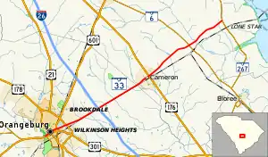 South Carolina Highway 33 (SC 33) is a 19.360-mile-long (31.157 km) state highway in the U.S. state of South Carolina. The highway connects Orangeburg with the Lone Star area, via Cameron.