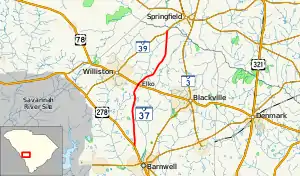 South Carolina Highway 37 (SC 37) is a 15.430-mile (24.832 km) primary state highway in the U.S. state of South Carolina. It provides a direct route between Barnwell and Springfield.