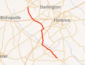 SC 403 is a two-lane rural highway that traverses for 36.1 miles (58.1 km) beginning north of Lake City, along SC 341. Going through a northeasterly direction to Hobbs Crossroads, it then goes north to Sardis. Connecting with Interstate 95 (I-95) north of Sardis, it continues north connecting with U.S. Route 76 (US 76) near and then through Timmonsville. At Windhams Crossroads, it connects with US 401, where it provides access to I-20. At Lees Crossroads, it reaches its northern terminus, an intersection with US 15/SC 34.[4] The vast majority of the landscape along the route is farmland, with the exception in and around Timmonsville.[5][6][7]