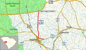 SC 430 begins at an intersection with SC 23 just northeast of Edgefield. This is also the northern terminus of SC 23 Truck, which begins concurrent with SC 430. The two highways head northwest, cutting across the northeast part of the city. They then intersect Meeting Street, which leads to the northbound lanes of U.S. Route 25 Business (US 25 Bus.). At this intersection, SC 23 Truck continues to the northwest, concurrent with the unsigned designation of SC 430 Conn. (which take on the Crest Road name). SC 430 turns right and heads to the north-northeast until it meets its northern terminus, at an intersection with US 378 on the southeastern edge of Sumter National Forest, in a rural part of the county.[2]