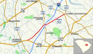 SC 53 begins at an intersection with US 378 (Myrtle Beach Highway) southwest of Shiloh, within Sumter County. It travels to the northeast, through rural areas of the county, and curves to a nearly due east direction. It intersects SC 58 (Pleasant Grove Road), and the two highways begin a concurrency. They have an interchange with Interstate 95 (I-95), where they enter Shiloh. Approximately 500 feet (150 m) later, SC 53 splits off to the south, onto Pudding Swamp Road. SC 53 continues through rural areas of the county to an intersection with SC 341 (Mt. Zion Road). About 2,000 feet (610 m) later is the highway's northern terminus, an intersection with SC 403 (Lynches River Road/Amwell Church Road). This is southwest of the Lynches River.[2]