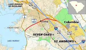 SC 60 is a mostly four-lane with median suburban highway that travels 5.16 miles (8.30 km) from SC 6 to U.S. Route 176 (US 176), with an interchange with Interstate 26 (I-26)/US 76.[3]