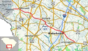 South Carolina Highway 64 (SC 64) is a 73.730-mile (118.657 km) primary state highway in the U.S. state of South Carolina. It serves the cities of Barnwell and Walterboro while also providing a direct route to Charleston, via U.S. Route 17 (US 17).[4]