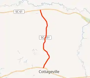 SC 651 begins at an intersection with U.S. Route 17 Alternate (US 17 Alt.; Cottageville Highway) in Cottageville, within Colleton County. It travels to the north-northeast and almost immediately leaves the city limits. The highway curves to the north-northwest and then heads on a fairly northerly direction before crossing over Horse Pen Branch. It curves again to the north-northwest and meets its northern terminus, an intersection with SC 61 (Augusta Highway).[2]