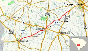 South Carolina Highway 70 (SC 70) is a 29.990-mile (48.264 km) primary state highway in the U.S. state of South Carolina. It connects the cities of Barnwell and Denmark with Orangeburg via U.S. Route 301 (US 301) and US 601.[4]