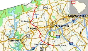 South Carolina Highway 8 (SC 8) is a 44.030-mile (70.859 km) primary state highway in the U.S. state of South Carolina. It travels from U.S. Route 276 (US 276) in northern Greenville County to US 25 and SC 418 in Ware Place. It travels physically north and south though it is signed as a west-east highway with its western terminus at US 276 and its eastern terminus at US 25/SC 418.