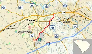 South Carolina Highway 80 (SC 80) is a 5.620-mile (9.045 km) primary state highway in the state of South Carolina. The highway serves as a bypass, connecting SC 14 to U.S. Route 29 (US 29) in Greer.