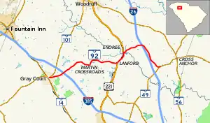 South Carolina Highway 92 (SC 92) is a 16.460-mile-long (26.490 km) state highway in the U.S. state of South Carolina. The highway connects Gray Court with the Enoree area.