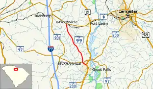 SC 99 begins at an intersection with U.S. Route 21 (US 21) and SC 200 (Pendergrass Boulevard) in Great Falls within Chester County. It travels to the northwest. On the edge of the city limits of the town is an intersection with SC 97 (Francis Avenue). They have a very brief concurrency. SC 99 travels in a north-northwesterly direction and passes Howze Cemetery. The highway continues traveling through rural areas and meets its northern terminus, an intersection with SC 9 (Lancaster Highway).[2]