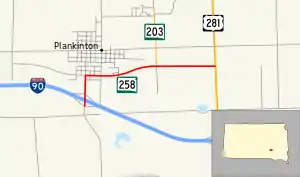 SD 258 begins at a diamond interchange with exit 308 of I-90 and travels north. The route enters the city of Plankinton almost immediately and continues north. The highway turns east onto Davenport Street in Plankinton and a curve takes the highway to the northeast. After leaving Plankinton, the road curves back to the east and continues through open plains for about one mile (1.6 km) before reaching its eastern terminus at an intersection with US 281. The roadway continues east of this intersection as County Road 34.[2][3]