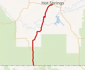 In the forest, the route meets the terminus of South Dakota Highway 471. After that, it leaves the forest and ends at US 18 Byp. in Hot Springs.[3]