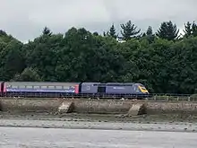 During significant high tide levels, trains belonging to the Class 220 and Class 221 fleets are restricted from operating along this route due to their vulnerability to the sea spray, unlike the Pacer, Sprinter and Class 43 fleets. A Class 800 has been tested along the line[38] with no significant problems occurring to the train, however the majority of trains that will replace the Class 43 HST will be the Class 802, a longer range version of the Class 800s.[39]