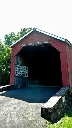 South Perkasie Covered Bridge is a historic wooden covered bridge located at Perkasie, Bucks County, Pennsylvania. It was built in 1832, and is a 93-foot-long (28 m) Town truss covered bridge. The bridge once crossed Pleasant Spring Creek, but was moved and rededicated on August 15, 1959, by Congressman Willard S. Curtin as a feature in Lenape Park. It is the oldest covered bridge in Bucks County.[2][3]