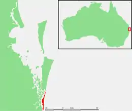The South Stradbroke Island (Indigenous: Minjerribah[2]), colloquially South Straddie,[3] is an island that lies within Moreton Bay in the Australian state of Queensland, south of Brisbane and forms the northern end of Gold Coast. The island is a locality within the City of Gold Coast.[4] In the 2016 census, South Stradbroke had a population of 41 people.[1]