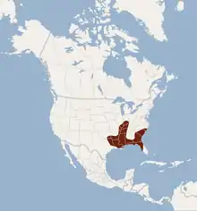 The range of this species includes southern Illinois and Indiana in the north, westward into southeastern Oklahoma, western Tennessee and Arkansas, and northeastern Texas, and eastward to the southern part of North Carolina. Disjunct populations of this species occur in the Ohio River Valley of Kentucky, and the majority of the population lives in the northern half of the peninsula of Florida[3]