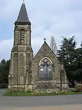 The grade II listed registrar's office near the entrance gateway was built in 1879 in the neo-Gothic style in sandstone with slate roofs.[7] Three service chapels are located in Southern Cemetery, only one of which is currently used for funeral services. The remaining two chapels are semi-derelict.