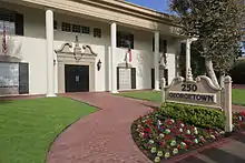 Set back from the street a wider distance than usual, the green front lawn contains colonial lampposts which stand guard by the street. Extensive use of colonial red brick is common for walkways and patio areas. A main door, intricately adorned with crown moldings, stands in the center between shuttered colonial windows. Within the portico, short flagpoles with American and colonial flags project diagonally outward from the front of the building.