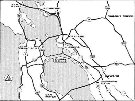 ![]() Map of San Francisco Bay with proposed Southern Crossing (1956 alignment) | |