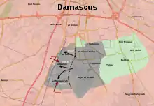 The Southern Damascus offensive (March 2018) started on 12 March 2018, when ISIL began attacking rebel positions in the al-Qadam neighborhood of southern Damascus as they were evacuating.[11] The rebel pocket in al-Qadam had been surrounded on one side by government forces and on the other by ISIL.[12] On 10 March, ISIL threatened to kill any rebels that evacuate from the area after the Syrian government gave the rebels 48 hours to surrender the district and evacuate.[13] Following news of the upcoming rebel evacuation from al-Qadam, ISIL forces attacked the rebels on 12 March and captured 25 percent of the neighborhood.[11] The next day, around 300 rebel fighters and their family members were evacuated from al-Qadam to rebel territory in Idlib province.[12] After the evacuation, government troops took control of 70 percent of the neighborhood, while the remaining 30 was under IS control.[14] During the fighting, government air-strikes were conducted against ISIL in Al-Hajar al-Aswad and al-Qadam.[15] While the clashes were taking place in Qadam, rebel groups attempted to break through ISIL lines in Yarmouk but were repelled.[16]