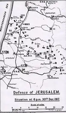 Allenby's strategical objective was a defeat of the Ottoman army in Southern Palestine, decisive enough to ensure Ottoman reinforcements destined for Baghdad were diverted to Palestine.[8] However, by 5 October, General William Robertson, CIGS, telegraphed Allenby that the War Cabinet desired him to eliminate the Ottoman Empire out of the war by a "heavy defeat", followed by the occupation of the Jaffa–Jerusalem line. He was to be supplied with "fresh British divisions ... at the rate of one every sixteen days." It was not until after the launching of the offensive that Allenby was told such increases to his force were improbable.[9]