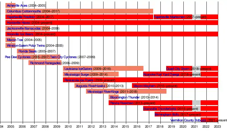 - Mississippi RiverKings (2011–18) Joined from the Central Hockey League in 2011, ownership suspended operations in 2018 while the league searches for new owners.