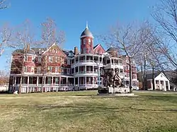 Southern Seminary Main Building, originally known as the Hotel Buena Vista and now Main Hall of Southern Virginia University, is a historic hotel building located at Buena Vista, Virginia. It was built in 1890, and is a 3 1/2-story, brick and frame building in an eclectic combination of Queen Anne and French Renaissance style architecture. It features a steep slate covered gable roof, round towers with conical and domical roofs, three-level wooden galleries, and Palladian windows. By 1907, the building was known as the Southern Seminary Main Building, after consolidation of three campuses of that school.[3]