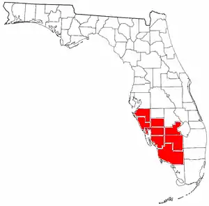 Definitions of the region vary, though its boundaries are generally considered to put it south of the Tampa Bay area, west of Lake Okeechobee, and mostly north of the Everglades and to include Manatee, Sarasota, Charlotte, Lee, and Collier counties. For some purposes, the inland counties of DeSoto, Glades, and Hendry, and the thinly populated mainland section of Monroe County, south of Collier, are also included.[1]