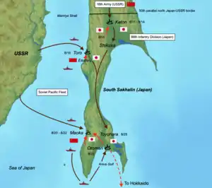 Soviet invasion of South Sakhalin, also called the Battle of Sakhalin (Russian: Южно-Сахалинская операция, Japanese: 樺太の戦い), was the Soviet invasion of the Japanese portion of Sakhalin Island known as Karafuto Prefecture. The invasion was part of the Soviet–Japanese War,[3] a massive campaign of the Second World War.