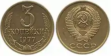 In 1935, the reverse of the 10к, 15к, and 20к coins were redesigned again with a more simple Art Deco inspired design, with the obverse of all denominations also redesigned, having the "Workers of the world, unite!" slogan dropped. The change of the obverse designs did not affect all 1к, 2к, 3к, and 5к coins immediately, as some 1935 issues bore the "Workers of the World" design while some bore the new "CCCP" design. The state emblem also went through a series of changes between 1935 and 1957 as new soviet republics were added or created, this can be noted by the number of "ribbons" wrapped around the wheat sheaves. This coin series remained in circulation during and after the monetary reform of 1947 and was finally discontinued in 1961.