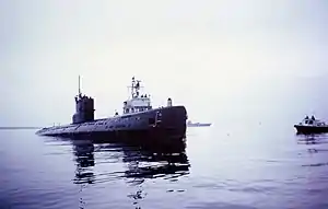 In October 1981, the Soviet submarine S-363 accidentally hit an underwater rock about 10 kilometres (6.2 mi) from the South Coast Naval Base at Karlskrona, surfacing within Swedish waters.[3] The boat's presence coincided with a Swedish naval exercise, testing new equipment, in the area. Swedish naval forces reacted to the breach of sovereignty by sending an unarmed naval officer aboard the boat to meet the captain and demand an explanation. The captain initially claimed that simultaneous failures of navigational equipment had caused the boat to get lost (despite the fact that the boat had already somehow navigated through a treacherous series of rocks, straits, and islands to get so close to the naval base).[3] The Soviet Navy would later issue a conflicting statement claiming that the boat had been forced into Swedish waters due to severe distress, although the boat had never sent a distress signal, and instead attempted to escape.[4]