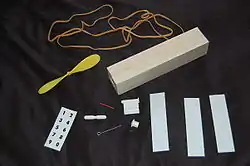 The space derby kit consists of a balsa wood block, propeller assembly, rubber bands, plastic sheet (for fins), and a mounting bracket. The wood block comes out of the box with a drilled out center hole. The block is carved into the desired shape, sanded and painted. The mounting bracket and fins can be added either before or after painting. The rubber band is inserted through the center hole with one end on the propeller and the other held in a cross-piece at the rear.