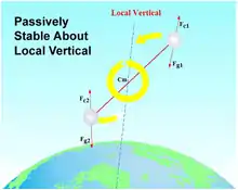 A non-rotating tether system has a stable orientation that is aligned along the local vertical (of the earth or other body). This can be understood by inspection of the figure on the right where two spacecraft at two different altitudes have been connected by a tether. Normally, each spacecraft would have a balance of gravitational (e.g. Fg1) and centrifugal (e.g. Fc1) forces, but when tied together by a tether, these values begin to change with respect to one another. This phenomenon occurs because, without the tether, the higher-altitude mass would travel slower than the lower mass. The system must move at a single speed, so the tether must therefore slow down the lower mass and speed up the upper one. The centrifugal force of the tethered upper body is increased, while that of the lower-altitude body is reduced. This results in the centrifugal force of the upper body and the gravitational force of the lower body being dominant. This difference in forces naturally aligns the system along the local vertical, as seen in the figure.[23]