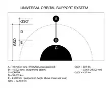 A theoretical type of non-rotating tethered satellite system, it is a concept for providing space-based support to things suspended above an astronomical object.[22] The orbital system is a coupled mass system wherein the upper supporting mass (A) is placed in an orbit around a given celestial body such that it can support a suspended mass (B) at a specific height above the surface of the celestial body, but lower than (A).