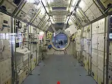 The habitable Spacelab laboratory module comprised a cylindrical environment in the rear of the Space Shuttle orbiter payload bay, connected to the orbiter crew compartment by a tunnel. The laboratory had an outer diameter of 4.12 m (13.5 ft), and each segment a length of 2.7 m (8 ft 10 in). The laboratory module consisted at minimum of a core segment, which could be used alone in a short module configuration. The long module configuration included an additional experiment segment.[10] It was also possible to operate Spacelab experiments from the orbiter's aft flight deck.[10]