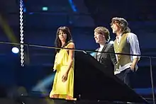 The Spanish performance featured the lead singer of ESDM Raquel del Rosario on stage barefoot wearing a yellow dress that she designed in collaboration with Yolanda Pérez from Spanish brand Yolancris.[35] Guitarists David Feito and Juan Luis Suárez wore more casual outfits and had no choreography for the performance, staying in one spot.[36][37] The band was joined by a violinist, a drummer/bagpipe player and a bassist, all of them which also performed backing vocals. The performance began with the bagpipe player standing on the catwalk of the stage, performing the first notes of the song. The stage lighting and LED screens first displayed blue and purple rays of the sun, with imitations of waterfall-like lamps falling from the ceiling, and the rear of the stage had white star-light twinkles projected onto it. The colours changed to shades of red and orange as the song rose in tempo to reflect the warmth of the song. Del Rosario walked along the catwalk of the stage and sang into a light box that lit up in yellow. The light box then rose upwards, along with several other lamps in the audience. The stage director for the performance was Pedro Castro.[37][38][39] The three backing performers that joined ESDM were Javi Mendéz, Mey Green and Milena Brody. Green was a backing vocalist for Spain in 2012.[40] Spain placed twenty-fifth in the final, scoring 8 points.[41][42]