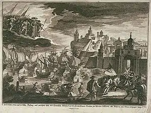 During the War of the Spanish Succession, the strategic African cities of Oran and Mers el-Kebir, which have been under Spanish control since the early 16th century, were taken by the Bey of Oran, Bouchlaghem Bey, taking advantage of the difficult time that Spain was going through.[11] With the war having ended, and with the resurgence of the new Spain as one of the major European powers, the King Philip V of Spain, organised an expedition to recoup the lost cities.[12] The expedition was, in part, funded by the successful offensive on the Republic of Genoa, led by the Admiral Don Blas de Lezo, in which Lezo demanded a payment of 2 million pesos, and to pay homage to the Spanish flag, or else he would bombard the city.[13][14] The Genovese finally accepted all the terms of the Spanish Admiral.[14] Of the 2 million pesos, a million and a half was to be destined for the new expedition.[14]