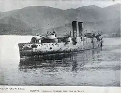 Vizcaya was built at Bilbao, Spain. She was laid down in 1889, launched on 8 July 1891, and completed in 1893.[1] She had two funnels and was fast and well armed. Her main armament was mounted on the center line in single barbettes fore and aft. Her armor was poor: her 11-inch (279 mm) guns had only lightly armored hoods, her 5.5-inch (140 mm) guns were mounted in the open on the upper deck, her armor belt was thin and protected only two-thirds of her length, and she had a high, unprotected freeboard that took much damage during the Battle of Santiago de Cuba. Like other nineteenth-century warships, she was heavily furnished and decorated with wood, which the Spanish failed to remove prior to combat and which would feed fires during the battle.[2]