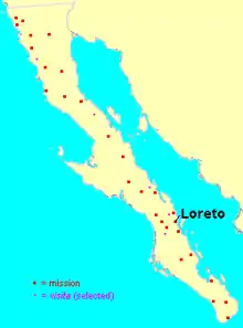 The Jesuit priest Juan María de Salvatierra eventually managed to establish the first permanent Spanish settlement in Baja California, the Misión Nuestra Señora de Loreto Conchó. Founded on October 19, 1697, the mission become the religious center of the peninsula and administrative capital of Las Californias. From there, other Jesuits went out to establish other settlements throughout the lower two-thirds of the peninsula, founding 17 missions and several visitas (sub-missions) between 1697 and 1767.[10]