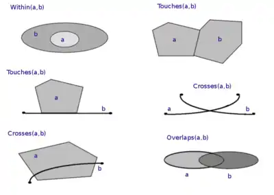 For any two spatial objects a and b, that can be points, lines and/or polygonal areas, there are 9 relations derived from DE-9IM: