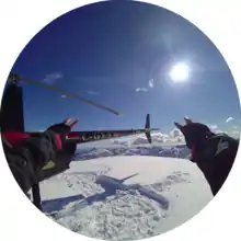 The original version of the glasses included a camera lens with a 115° field of view (110° on V2) and records in a circular format that adapts to a smartphone's screen size and orientation.[22] The smartglasses record when the user presses a button on the top left of its frame, for a maximum of 30 seconds (in 10 second intervals).[22] They sync with its designated smartphone via Bluetooth and Wi-Fi.[23] The camera also houses a ring of LED lights that indicates battery level and when they are recording. The pair of glasses charge in a yellow case that has a built-in battery and connects to its proprietary cable.[24] The cable can be attached either to the case or directly to the glasses. According to the manufacturer, the fully charged case will hold enough power to recharge the glasses four times.[25] The lithium-ion batteries in both the case and the glasses draw power from a standard 5 volt USB power supply, and connect via a USB cable which is held in place by small magnets.[26]