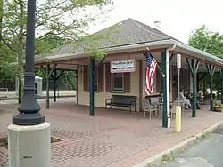 Speonk station was originally built in February 1870 along what was then the Sag Harbor Branch. From 1895 to 1897 it was known as "Remsenburg station", acknowledging the hamlet of Remsenburg, New York, which lies just south of Speonk. The station was struck by lightning and burned on June 22, 1901,[2] and a second depot opened in December 1901. Railroad conductors frequently accentuated the name when calling it out as the next station. This latter agency and depot were closed in 1958, and the station has been unmanned ever since. The former station was converted into a snack bar that is still operating as the Trackside Cafe restaurant.[3]