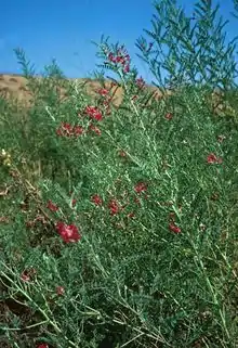Sphaerophysa salsula is a species of flowering plant in the legume family known by the common names alkali swainsonpea,[1] Austrian peaweed, and red bladder-vetch. It is native to Asia but it is known in many other parts of the world as an introduced species and often a noxious weed. It grows in cultivated land and disturbed habitat, easily tolerating alkaline substrates. It is commonly seen in areas where alfalfa is grown, because the seeds of the two species look similar and the weed seed is easily imported with the crop seed.[2]