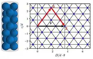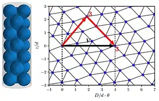 For all uniform structures above a diameter ratio of , the regular hexagonal lattice is its characterising feature since this lattice type has the maximum number of contacts.[21] For different uniform structures the rolled-out contact pattern only varies by a rotation in the plane. Each uniform structure is thus distinguished by its periodicity vector , which is defined by the phyllotactic triplet .