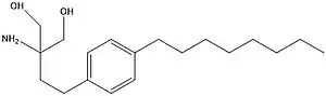 To find the lead optimization a part of the fatty acid side chain was replaced with 1,4-disubstituted phenyl ring. This was done to decrease the bond rotation. The phenyl ring was moved along the side chain to find its optimal position. These efforts resulted in the two carbon linkers from the polar head group to the phenyl moiety. The resulting product was FTY720 as shown in illustration 2 and its activated, phosphorylated form in illustrations 3a and 3b. Research showed that FTY720 had the same efficacy as ISP-1 in vitro. Moreover, it was found that FTY720 is 100 times more efficient than Cyclosporin A against experimental autoimmune encephalomyelitis (EAE) in an animal model of multiple sclerosis.[7][9]