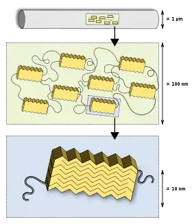 Silks, like many other biomaterials, have a hierarchical structure. The primary structure is the amino acid sequence of its proteins (spidroin), mainly consisting of highly repetitive glycine and alanine blocks,[26][27] which is why silks are often referred to as a block co-polymer. On a secondary structure level, the short side chained alanine is mainly found in the crystalline domains (beta sheets) of the nanofibril, glycine is mostly found in the so-called amorphous matrix consisting of helical and beta turn structures.[27][28] It is the interplay between the hard crystalline segments, and the strained elastic semi-amorphous regions, that gives spider silk its extraordinary properties.[29][30] Various compounds other than protein are used to enhance the fibre's properties. Pyrrolidine has hygroscopic properties which keeps the silk moist while also warding off ant invasion. It occurs in especially high concentration in glue threads. Potassium hydrogen phosphate releases hydrogen ions in aqueous solution, resulting in a pH of about 4, making the silk acidic and thus protecting it from fungi and bacteria that would otherwise digest the protein. Potassium nitrate is believed to prevent the protein from denaturing in the acidic milieu.[31]